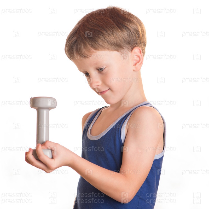 Мальчик делает упражнения с гантелями