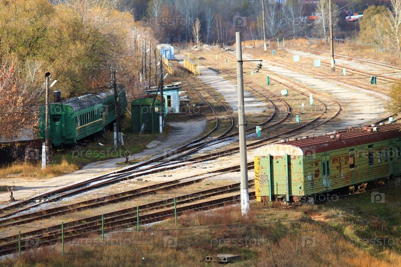 Старые брошенные вагоны по обеим сторонам железнодорожных путей