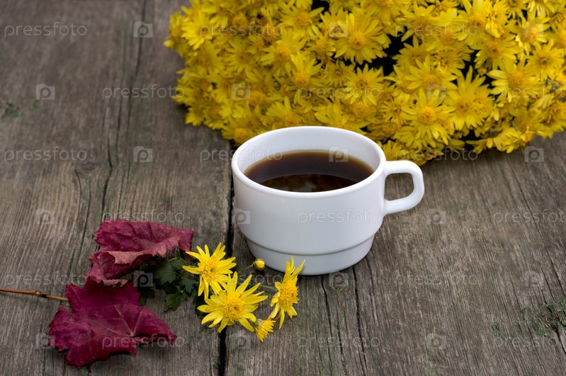 Букет из желтых цветов, кофе и осенние листья