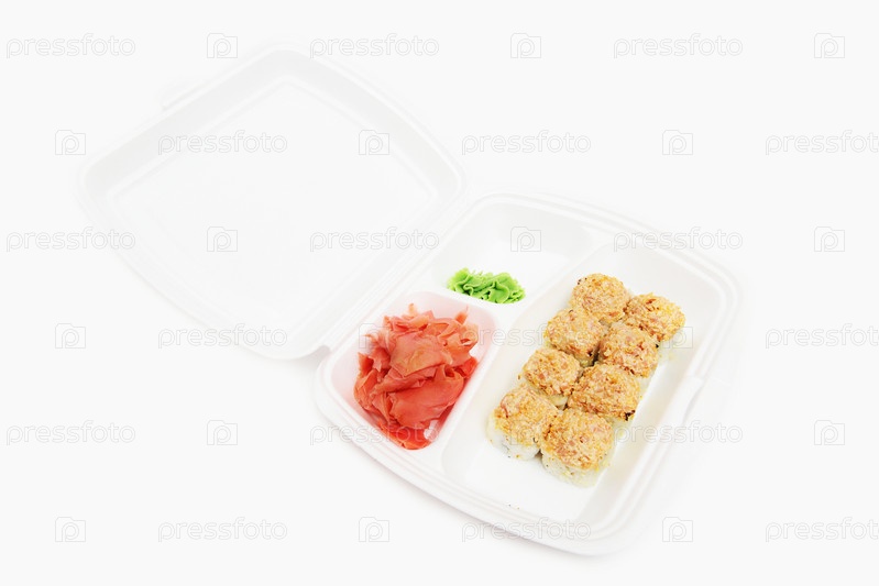 Японский рулетики с рыбой и овощами в контейнере, изолированные на белом фоне