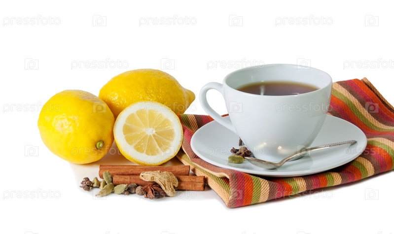 Черный чай с лимоном и специями, изолированные на белом фоне