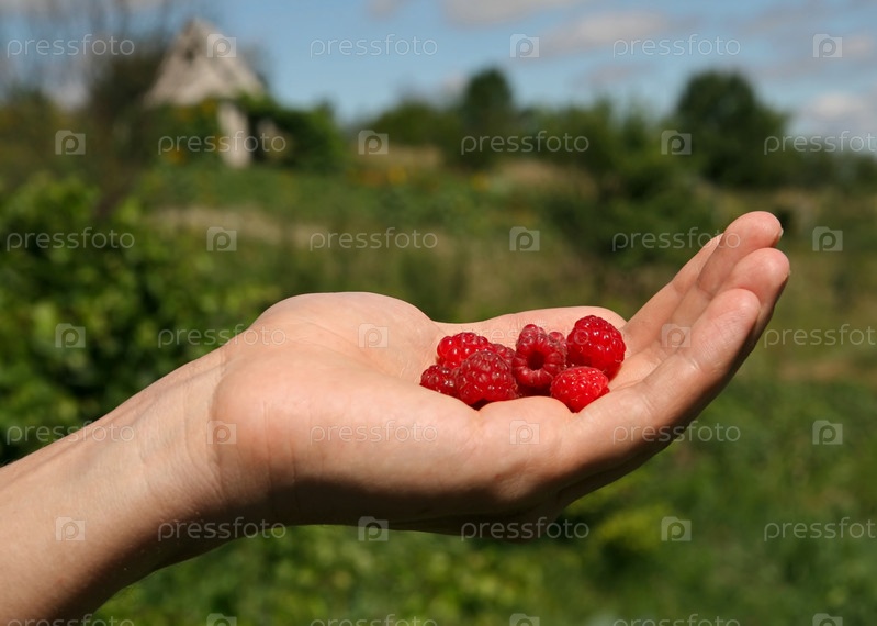 Горсть малины в руке