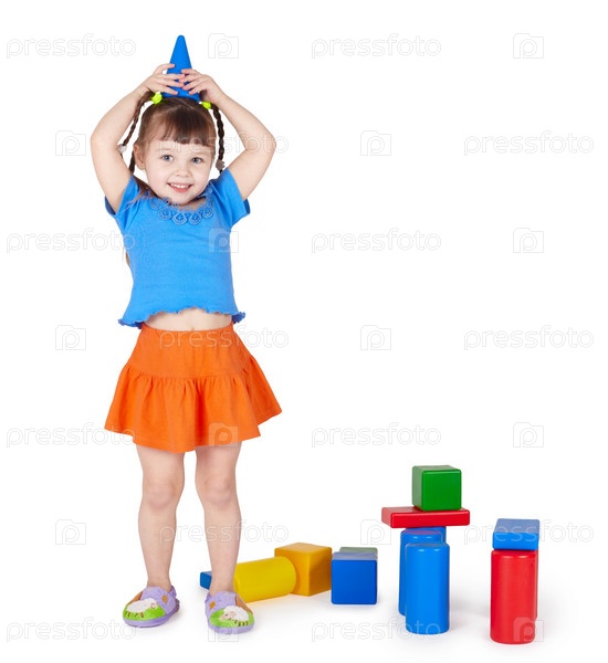 Маленькая девочка играет цветными блоками на белом фоне