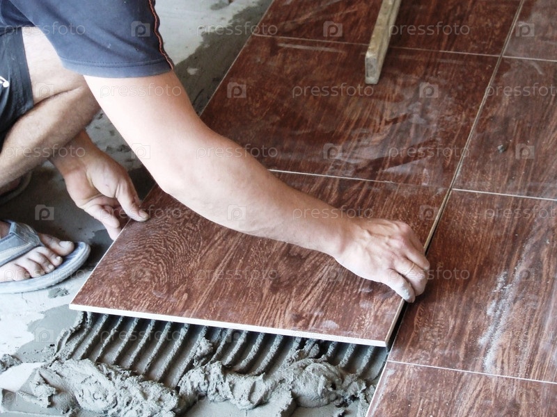 Мужчина укладывает кафельную плитку на пол