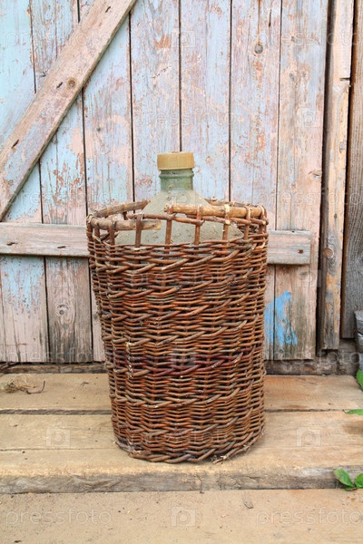 Корзина с бутылкой на фоне забора