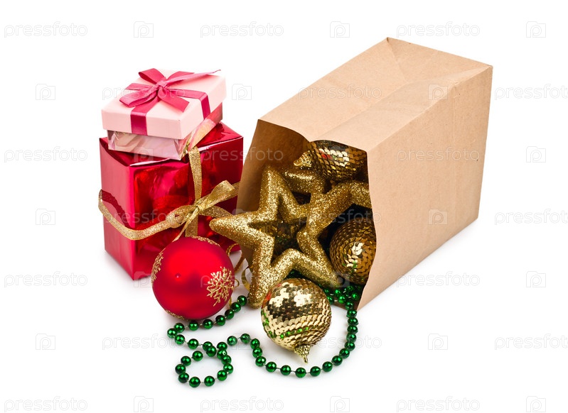 Новогодние украшения, шары, звезды, в бумажном пакете после покупки, на белом фоне