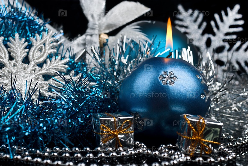 Новогодние украшения и горящая свеча на черном фоне