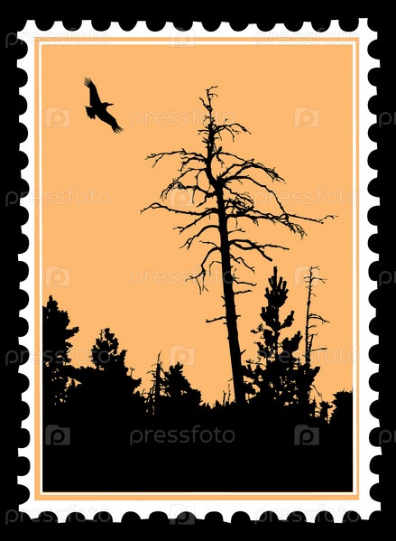 Деревья и птица на почтовой марке