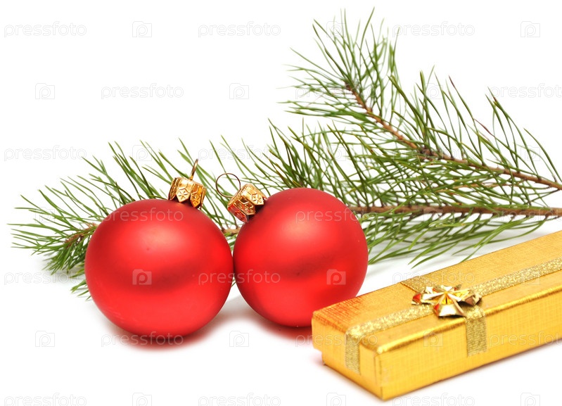 Рождественский подарок, елочные шары и ветка на белом фоне