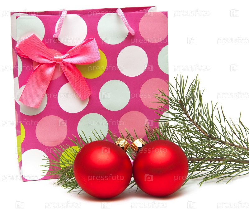 Рождественский подарок, елочные шары и ветка на белом фоне