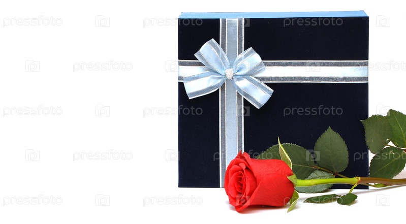 Красная роза и синяя подарочная коробка на белом фоне