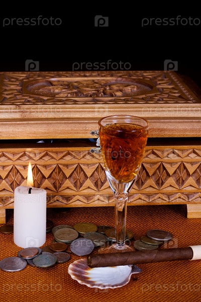 Шкатулка, свечка, стакан с виски и сигара на столе