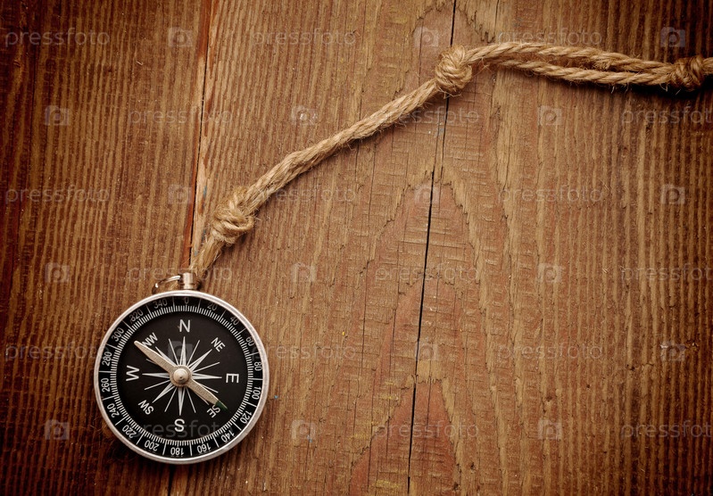 Компас и веревка на деревянном фоне