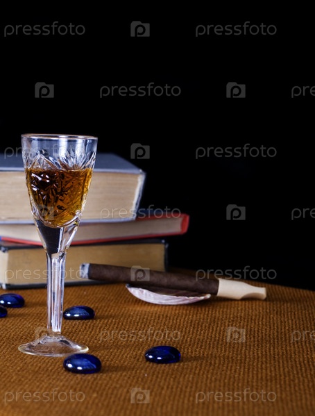 Хрустальный стакан с виски, сигара на фоне книг