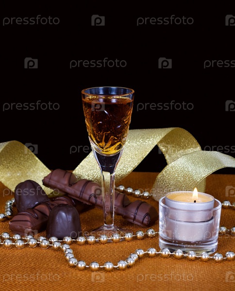 Хрустальное стекло с коньяком, шоколадом и золотые ленты на столе