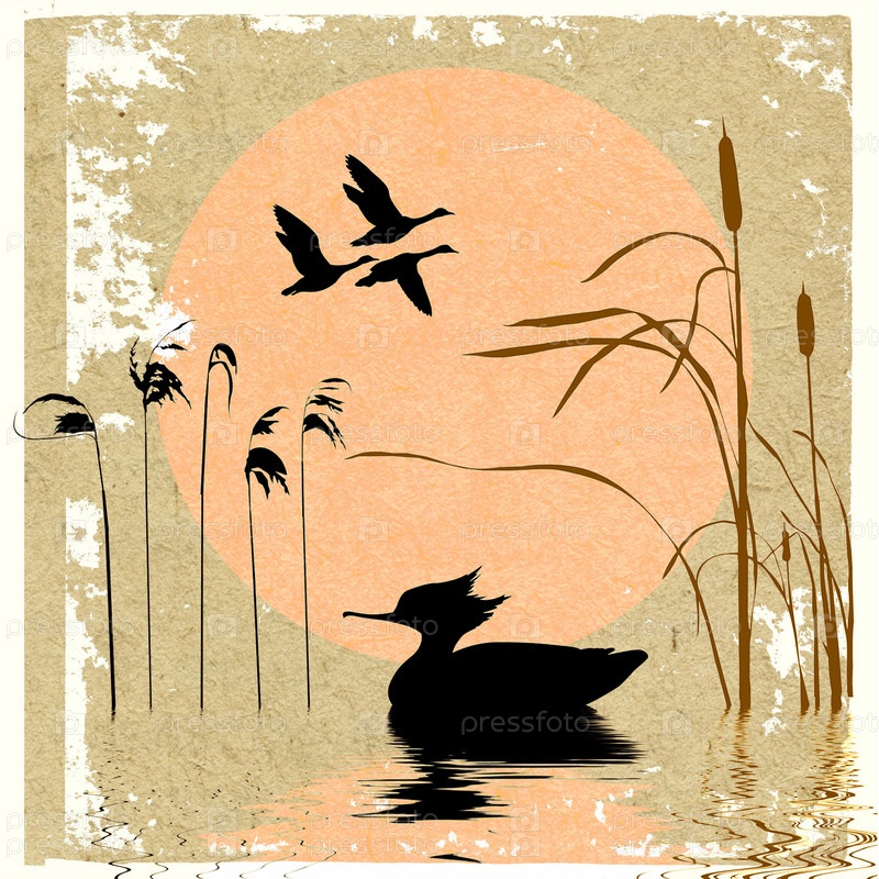 Изображение утки в пруду на старой бумаге