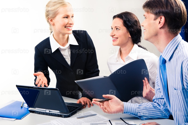 Фото бизнес-леди у ноутбука, указывающей на монитор и с улыбкой смотрящей на коллег