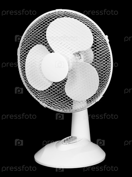 Столовой пластиковый электрический вентилятор изолирован на черном фоне