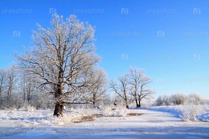 Заснеженный лес на берегу замерзшей реки