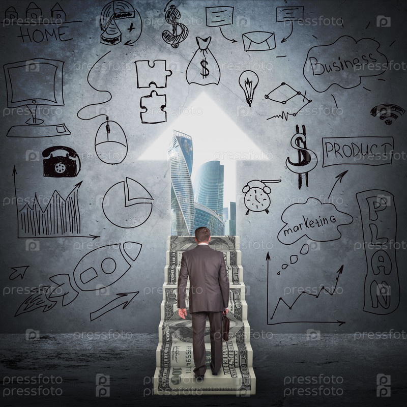 Бизнесмен с чемоданом идти вверх по лестнице деньги