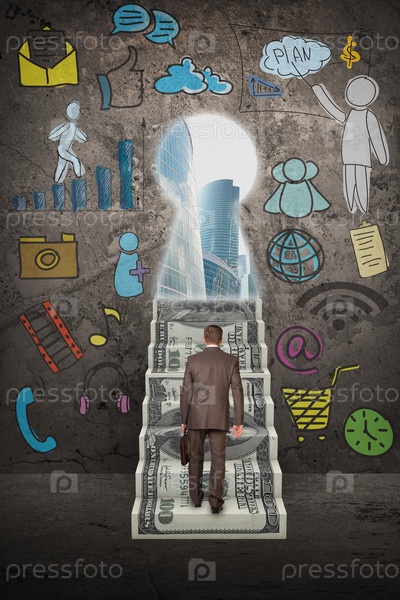 Бизнесмен идти вверх по лестнице деньги город