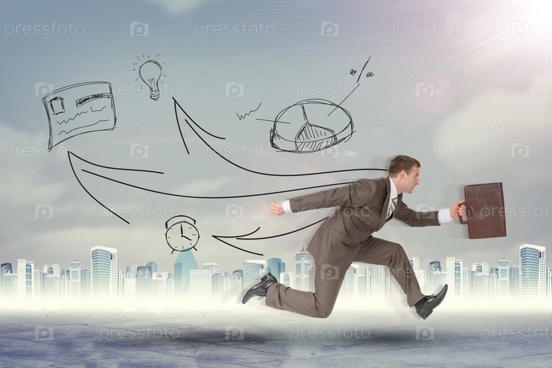 Бизнесмен, работает быстро, с чемоданом на абстрактный фон