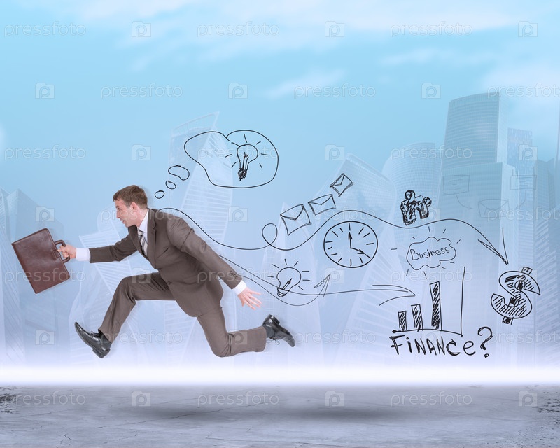 Бизнесмен, работает быстро, с чемоданом на абстрактный фон