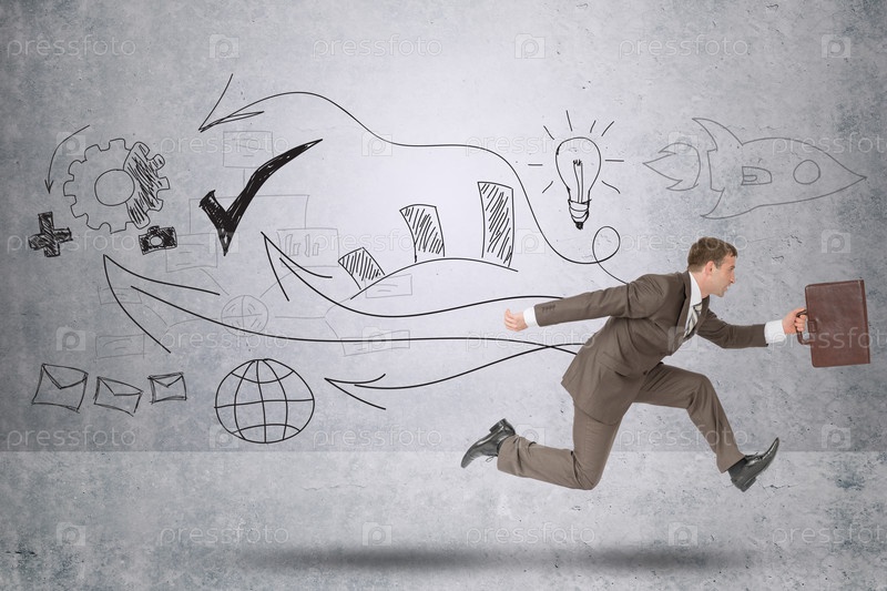 Бизнесмен, работает быстро, с чемоданом на абстрактный фон