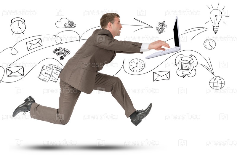 Бизнесмен, работает быстро с ноутбуком на изолированный белый фон