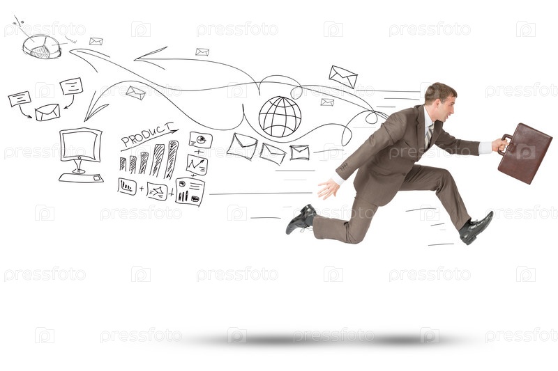 Бизнесмен, работает быстро, с чемоданом на изолированный белый фон