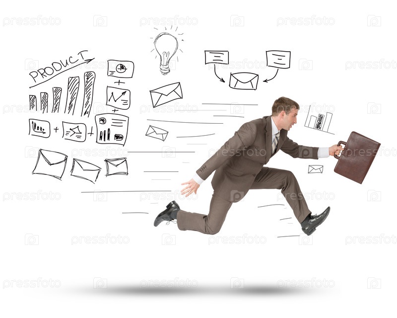 Бизнесмен, работает быстро, с чемоданом на изолированный белый фон