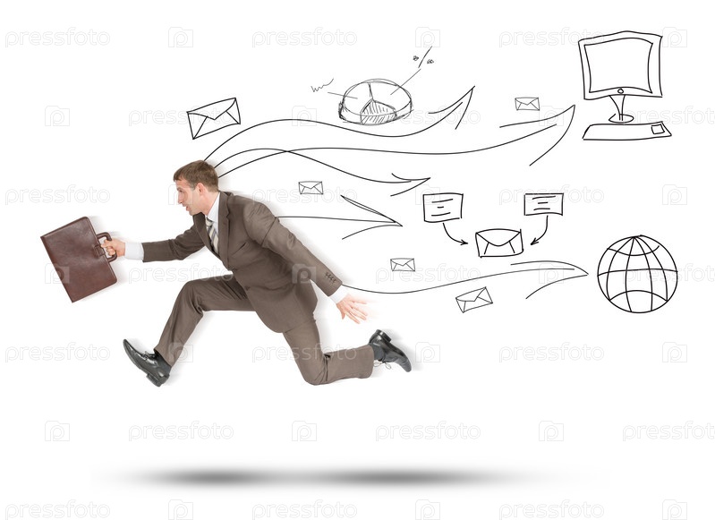 Бизнесмен, работает быстро, с чемоданом на изолированный белый фон