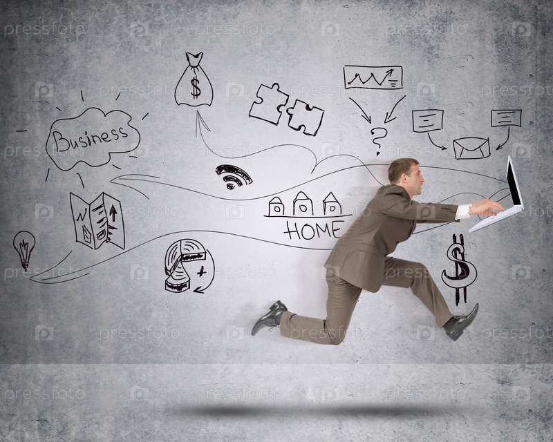 Бизнесмен, работает быстро с ноутбуком на абстрактный фон