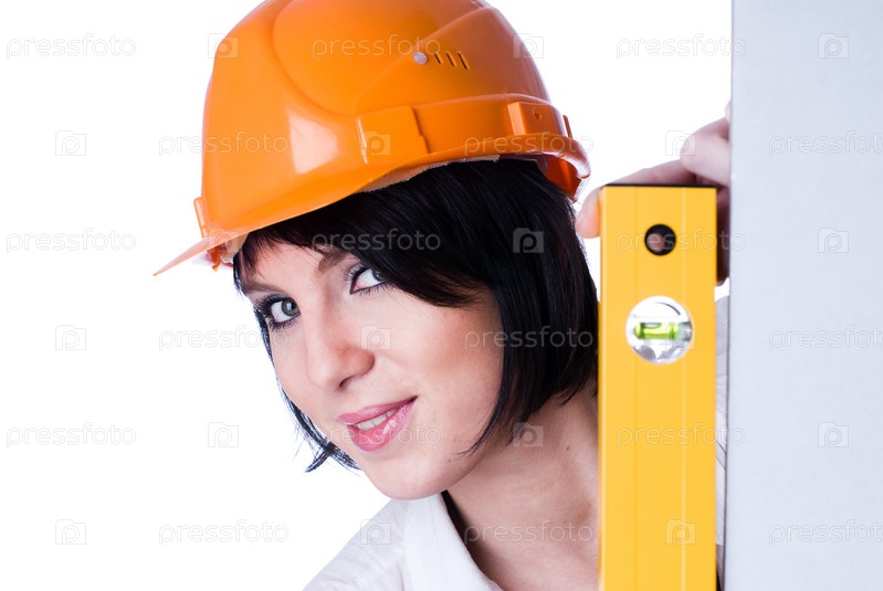 Молодая женщина в каске со строительным уровнем, изолирована на белом