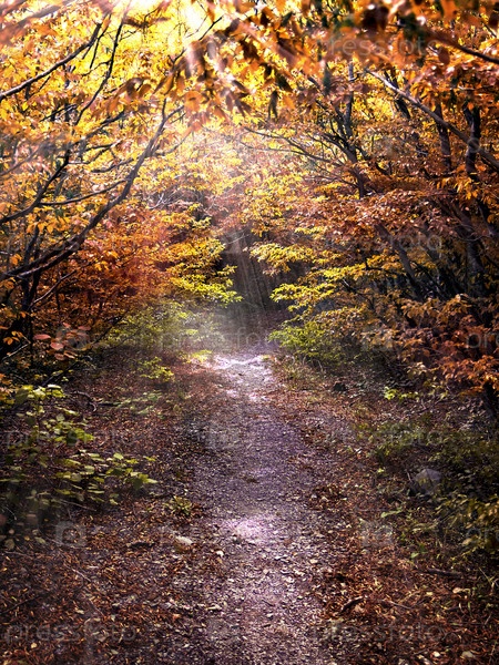 Путь в лесу осенью, освещенные солнцем