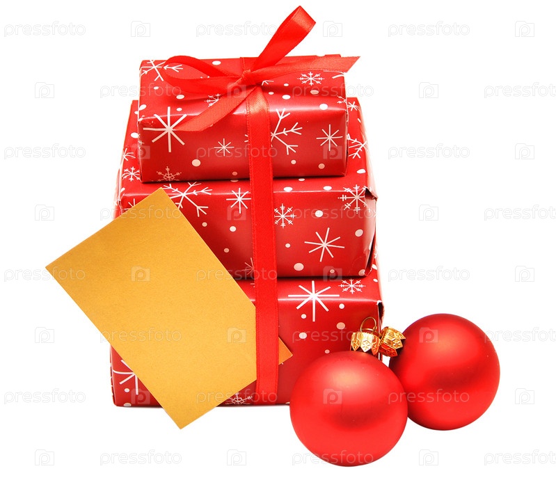 Рождественские подарки с красными елочными шарами и открыткой для приветствия на белом фоне