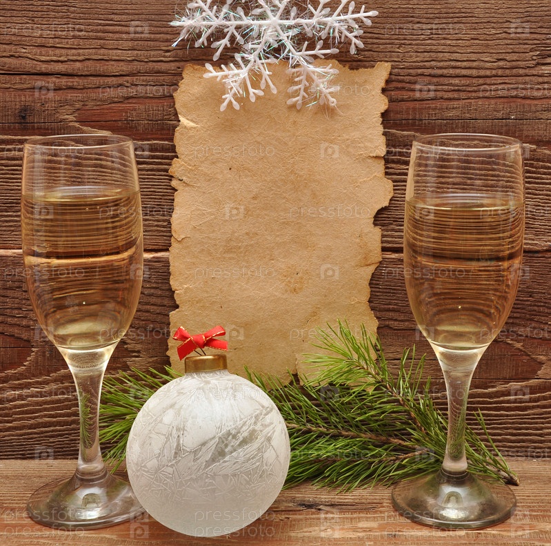Новогоднее украшение и старый лист бумаги на деревянном фоне