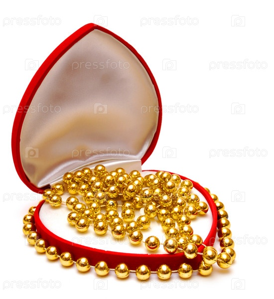 Красный футляр в форме сердца и ожерелье на белом фоне