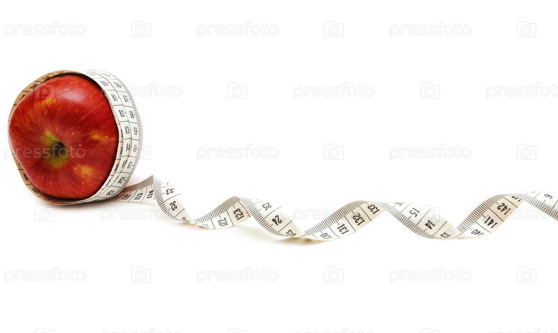 Красное яблоко, обмотанное метром на белом
