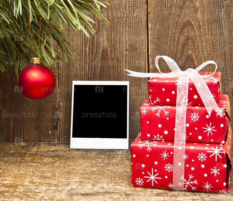 Новогоднее украшение и старая фотография на деревянном фоне