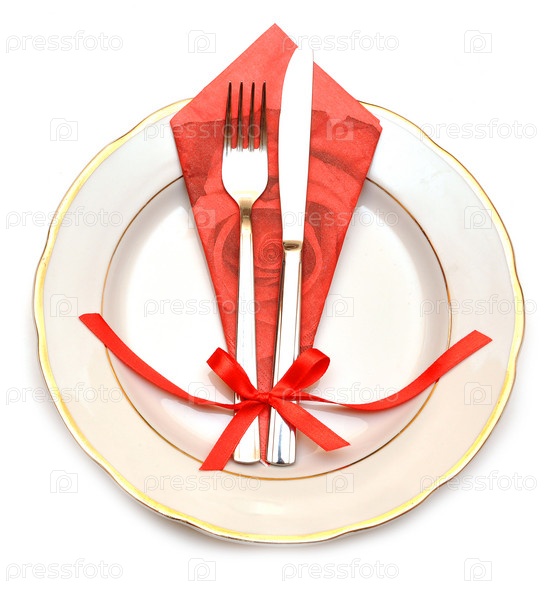 Праздничная сервировка: пустая тарелка, нож, вилка и салфетка
