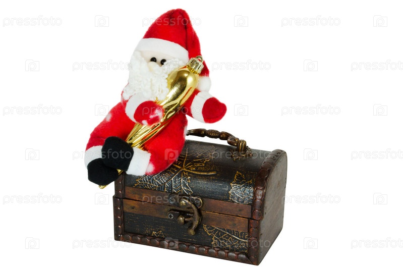 Санта Клаус, сидящий на антикварном сундуке, на белом фоне