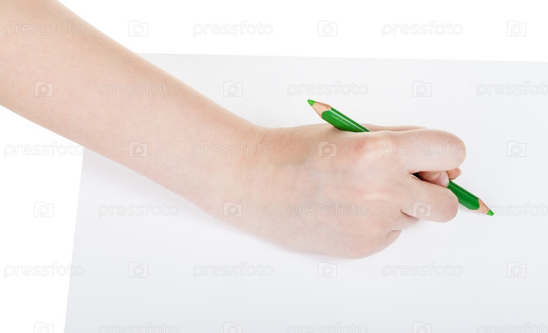 Рука пишет зеленым карандашом на листе бумаги