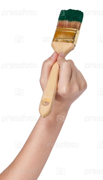 Рука художника с плоской кистью краски в зеленом