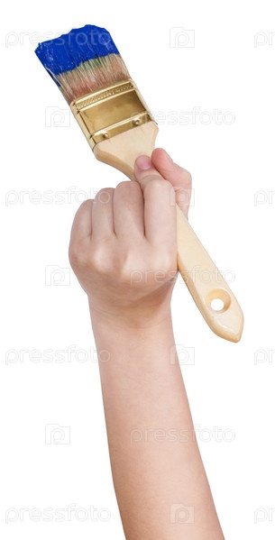 Рука художника с плоской кистью краски в голубом