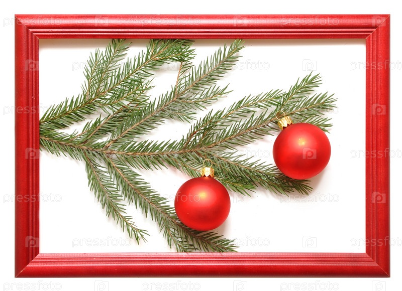 Елочная ветка с шарами в рамке на белом фоне