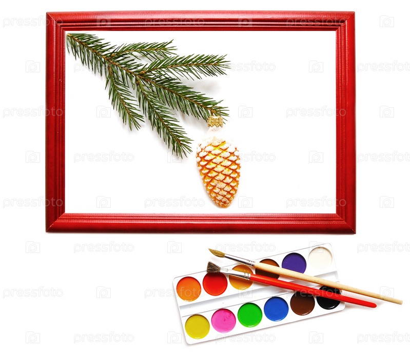 Елочная ветка с шишкой в рамке и краски на белом фоне