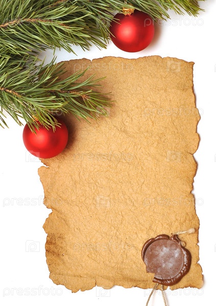 Старый лист бумаги с печатью и сосновая ветка с шарами