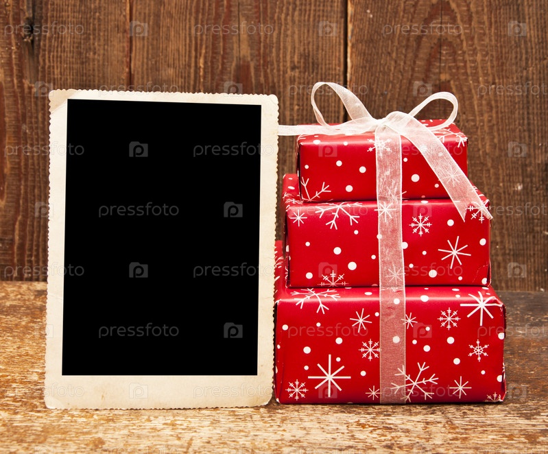 Рождественские подарки и старое фото на деревянном фоне