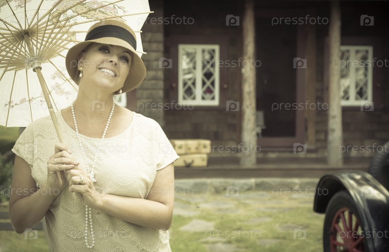 1920-х одетая девушка с зонтиком возле старинных автомобилей портрет